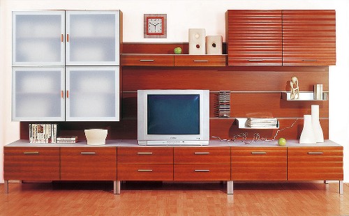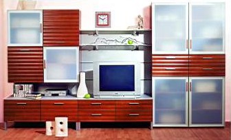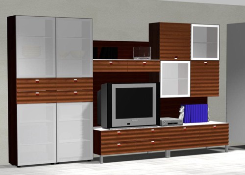 Фасады в этой серии мебели изготовлены из ДСП отделанной шпоном вишни и рамочных алюминиевых фасадов с пластиком метакрилатом - высокотехнологичным, современным материалом. При изготовлении стенки используется ДСП, ДВП, крепёжная фурнитура, кромочные материалы производства Италии и Германии. Ручки на рамочных фасадах отделаны натуральной кожей.