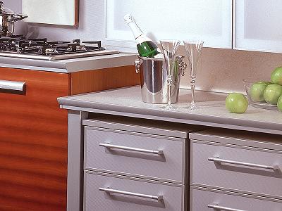 Мебель изготовлена с использованием фасадов (производства Италии), отделанных натуральным шпоном вишни, и рамочных алюминиевых фасадов с пластиком метакрилатом - высокотехнологичным, современным материалом итальянского производства. В кухне широко применяется ультрасовременная алюминиевая отделка: торцы фасадных элементов столешниц, а также алюминиевые цоколи, опоры и аксессуары.
